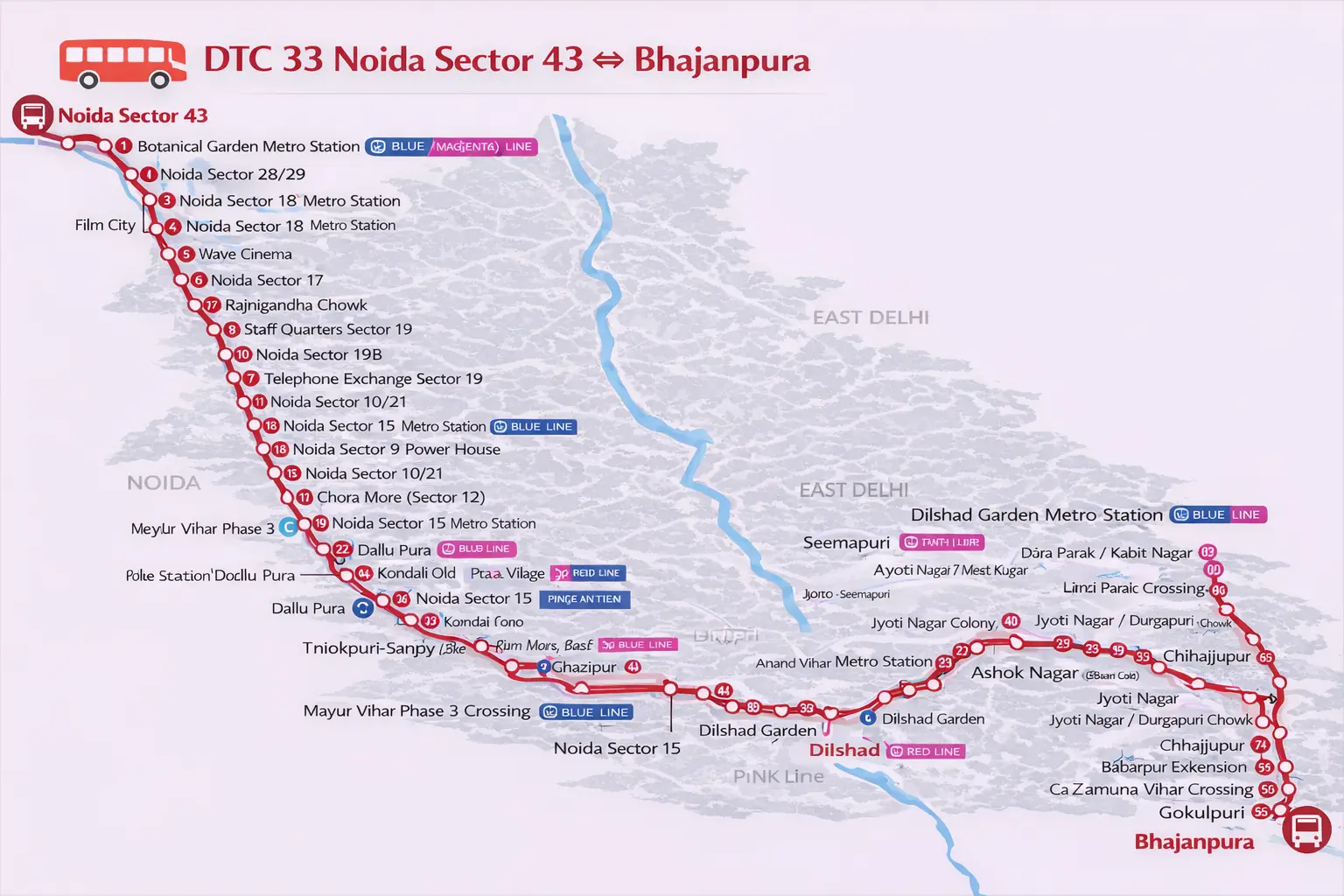 DTC 33 is an important cross-city bus route linking Noida with East and North-East Delhi.The route spans approximately 32-36 km with an average travel time of 1 hr 30 min to 2 hr 15 min, depending on traffic conditions. Starting from Noida Sector 43, the route passes through major commercial and residential areas such as Botanical Garden, Sector 18, Film City, Mayur Vihar Phase 3, Ghazipur, and Anand Vihar ISBT, then continues via Dilshad Garden, Seemapuri, and Nand Nagari before reaching Yamuna Vihar and Bhajanpura.